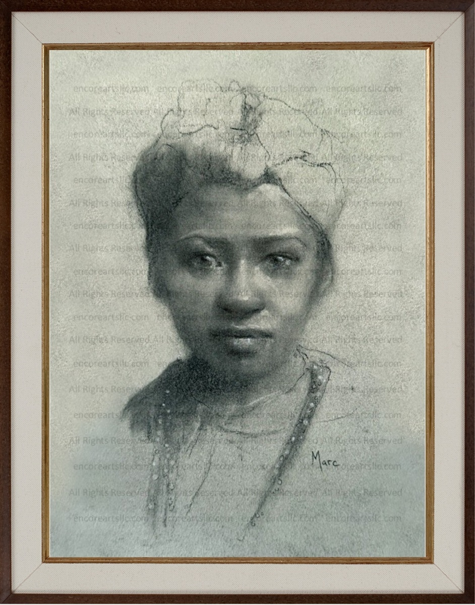 His works are rendered in oil, charcoal, chalk, or grisaille. Marc’s process is intuitive and reflective, allowing the portrait to unfold with its own rhythm and voice. Each print speaks to those who appreciate the softness of a line, the weight of a shadow, the hush of a gaze.
